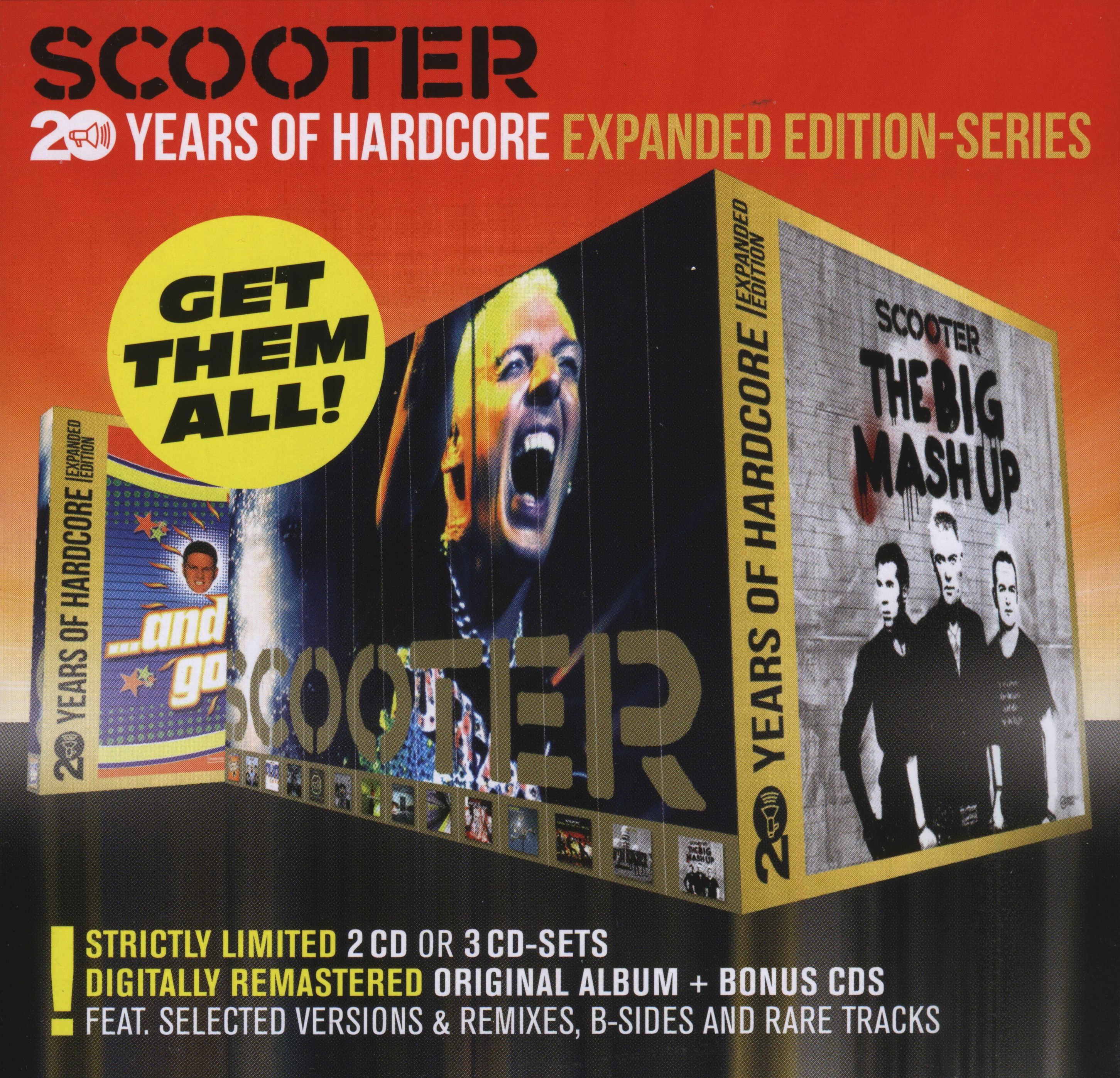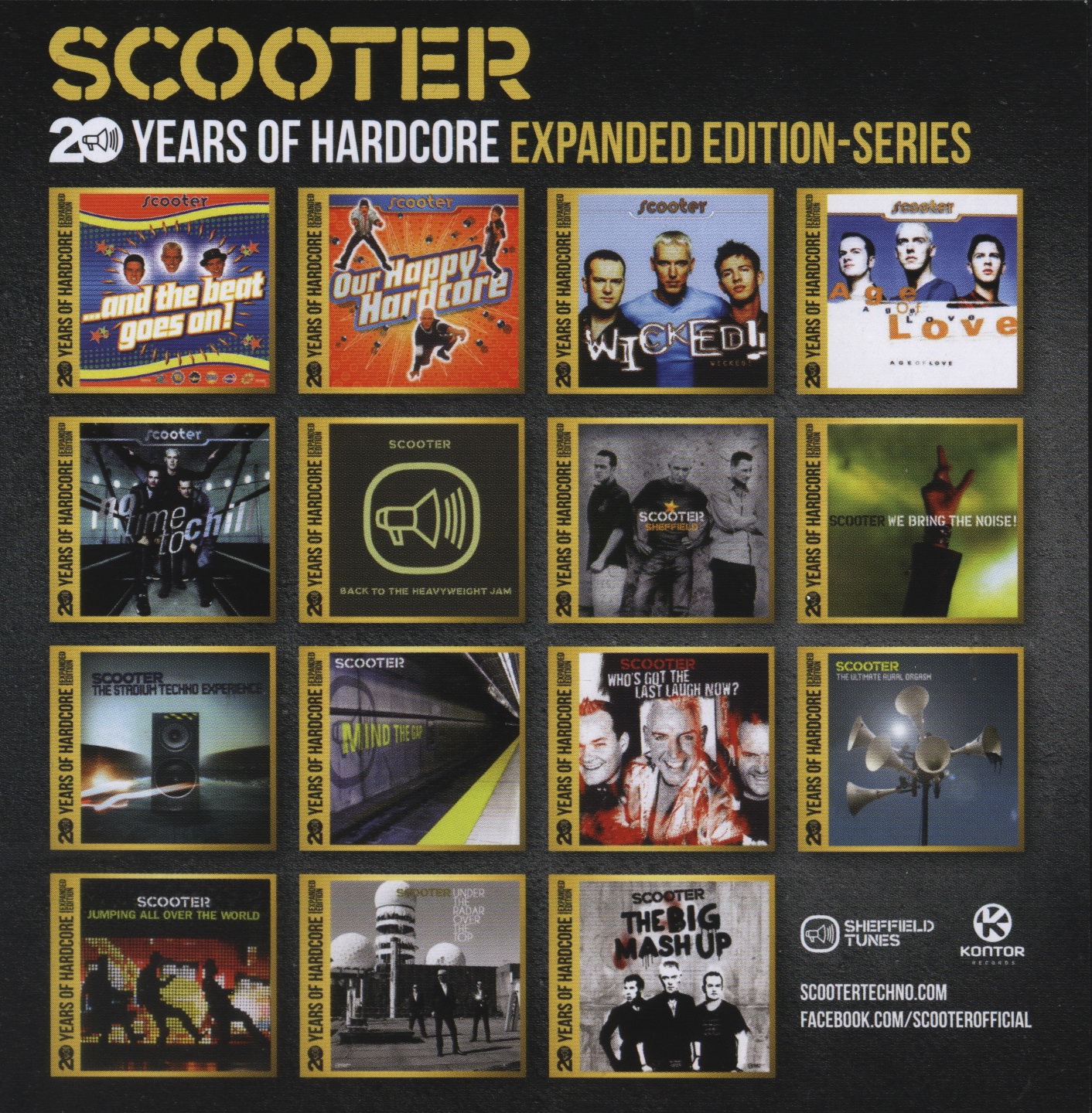 On! - 20 Years of Hardcore (Expanded edition) Web Germany - musicload.de 01. (5:31) Different Reality 02. (5:37) Move Your Ass 03. (4:28) Waiting For Spring 04. (4:04) Endless Summer 05. (6:06) Cosmos 06. (6:02) Rhapsody In E 07. (5:01) Hyper Hyper 08. (6:05) Raving In Mexico 09. (5:13) Beautiful Vibes 10. (5:11) Friends 11. (5:07) Faster Harder Scooter 12. (6:45) Vallee De Larmes 13. (4:35) Vallee De Larmes - Re-Incarnation by The Loop! version 14. (5:10) Hyper Hyper - On A Spanish Fly Tip 15. (2:53) Hyper Hyper - Prezioso Mix 2 16. (5:16) Modeselektor feat. Otto V. Schirach - Hyper Hyper 17. (7:14) Move Your Ass - Ultra-Sonic Rmx 18. (6:27) Move Your Ass - Mandala Rmx 19. (5:47) Move Your Ass - Mega'lo Mania-Acid Mania Mix 20. (3:21) Move Your Ass - Para-Dizer Rmx 21. (5:52) Move Your Ass - Men Behind Rmx 22. (5:31) Move Your Ass - Alien Factory Rmx 23. (5:27) Move Your Ass - Matiz Rmx 24. (3:27) Sido feat. Scooter, Kitty Kat & Tony D - Beweg Dein 25. (4:40) Friends - Single Version 26. (5:32) Friends - Ramon Zenker Club Mix 27. (4:30) Friends - Jeyenne Mix 28. (5:13) Endless Summer - Maxi Version 29. (4:52) Endless Summer - Datura Remix 30. (4:52) Endless Summer - Datura Instrumental version 31. (8:53) Endless Summer - Microwave Prince remix 32. (5:10) Endless Summer - Spanish Version 33. (6:05) Endless Summer/Hyper Hyper/Move Your Ass - Live in Hamburg 34. (6:02) Unity Without Words Part 1 35. (5:46) Across The Sky 36. (7:04) Back In Time |