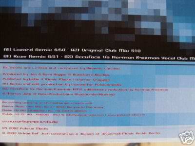 12" Germany - Urban Def Jam Labelgroup # URBDJ 2254 # 019 398-1 A1. Lazard remix (6:50) A2. Original Club mix (5:10) B1. Kaze remix (6:51) B2. Accuface vs. Norman Freeman Vocal Club mix |