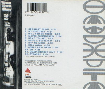 US CDM USA/Canada - Enigma # 7 75556-2 USA/Canada - Enigma # 7 75556-2 Misprint (13 tracks Grey Piccolo - Heavy Juice album instead single) 1. She's a Secretary - Gothic mix (5:25) 2. She's a Secretary - Gothic Dub (3:36) 3. She's a Secretary - Nonne mix (4:24) 4. She's a Secretary - Monja mix (5:32) 5. She's a Secretary - Spastic Dub (6:01) 6. Strange (5:09) 7. Will You Be There - 12" Version (5:30) |