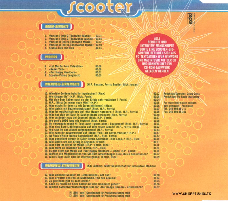 Scooter - Our Happy Hardcore - Radio-Press Kit Germany - Edel # 0062475CLU RADIO-BERICHTE 1. Version I (mit O-Tönen/mit Musik) (03:31) 2. Version I (mit O-Tönen/ohne Musik) (03:04) 3. Version II (mit O-Tönen/mit Musik) (03:12) 4. Version II (mit O-Tönen/ohne Musik) (02:59) 5. Studio-Talk mit Rick (04:43) PROMOS 6. Let Me Be Your Valentine (00:06) 7. Rebel Yell (00:06) 8. Our Happy Hardcore (00:07) 9. Scooter-Promo (englisch) (00:09) INTERVIEW-STATEMENTS 10. Wieviele Goldene habt ihr inzwischen? (Rick) (00:12) 11. Wo hängen die? (H.P., Rick, Ferris) (00:28) 12. Hat sich Euer Leben nach so viel Erfolg sehr verändert? (Ferris) (00:24) 13. H.P. fährst Du immer noch Mini? (H.P.) (00:15) 14. Was macht Ihr denn so mit Euren Millionen? (Rick) (00:36) 15. Wie steht's mit Beziehungskisten? Rick, H.P., Ferris) (01:03) 16. Was ist musikalisch neu auf Our Happy Hardcore? (Rick, H.P.,Ferris) (01:09) 17. Was hat sich bei Euch in Sachen Beats verändert (Rick, Ferris) (00:48) 18. Wer verändert was bei Scooter? (Rick, H.P., Ferris) (01:07) 19. Wo geht's 1996 lang mit Techno? (Rick, Ferris) (01:09) 20. Ihr verwendet neben Hi-Tech auch gutes altes Equipment? (Rick,H.P.,Ferris) (01:10) 21. Was sind Eure Lieblingstracks auf dem neuen Album? (H.P., Ferris,Rick) (01:02) 22. Wo habt Ihr das Album aufgenommen? (H.P., Ferris) (00:43) 23. Wie kommt Ihr ausgerechnet auf Rebel Yell als Cover-Version? (H.P.) (00:47) 24. Ist Rock'n Rolle techno-kompatibel? (H.P., Rick, Ferris) (00:52) 25. Was geschieht derzeit in Eurer Remix-Schmiede The Loop? (H.P.,Rick) (00:19) 26. Wie steht's um den Erfolg in England? (Ferris) (00:37) 27. Was hört Ihr privat für Musik ? (H.P., Ferris, Rick) (01:11) 28. Was steht an Tourneen an? (Ferris, H.P., Rick) (01:24) 29. Es gibt nciht nur Musik auf Our Happy Hardcore? (Rick, H.P.,Ferris) (01:18) 30. Werden die Möglichkeiten von CD-Rom-Anwendungen Eure Musik beeinflussen? (00:32) 31. Wird's Euch auch bald im Internet geben? (Ferris, Rick) (00:39) INTERVIEW-STATEMENTS 32. Was zeichnet Scooter als interaktiven Act aus? (00:50) 33. Was erwartet den Fan im Multimedia-Teil des Albums? (01:04) 34. Zu gewinnen gibt es auch etwas? (00:25) 35. Kann es Probleme beim Ablauf auf dem Computer geben? (00:56) 36. Welche Systemvoraussetzungen sind für Our Happy Hardcore erforderlich? (00:52) +Multimedia: text files with interview, biography, group info |